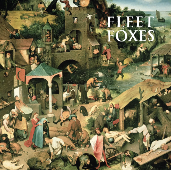 The appeal of fall as nearly every artsy person’s favorite season can be explained by its rich imagery and aesthetics: pumpkins, apple cider, sweaters, crunchy leaves, Gilmore Girls, warm color palettes, chunky knits… the list is never ending. Fleet Foxes contributes to and upholds this imagery. The album covers themselves are works of art. The first album shows a warm medieval painting of various mishaps and slapstick gags (I dare you to spot all the butts!). The second album has that fall color palette, landscape background, and even a black cat. Both covers are so rich in images and small details to pick out, and this is just where the aesthetics start; the music adds layer upon layer of new sounds to discover.